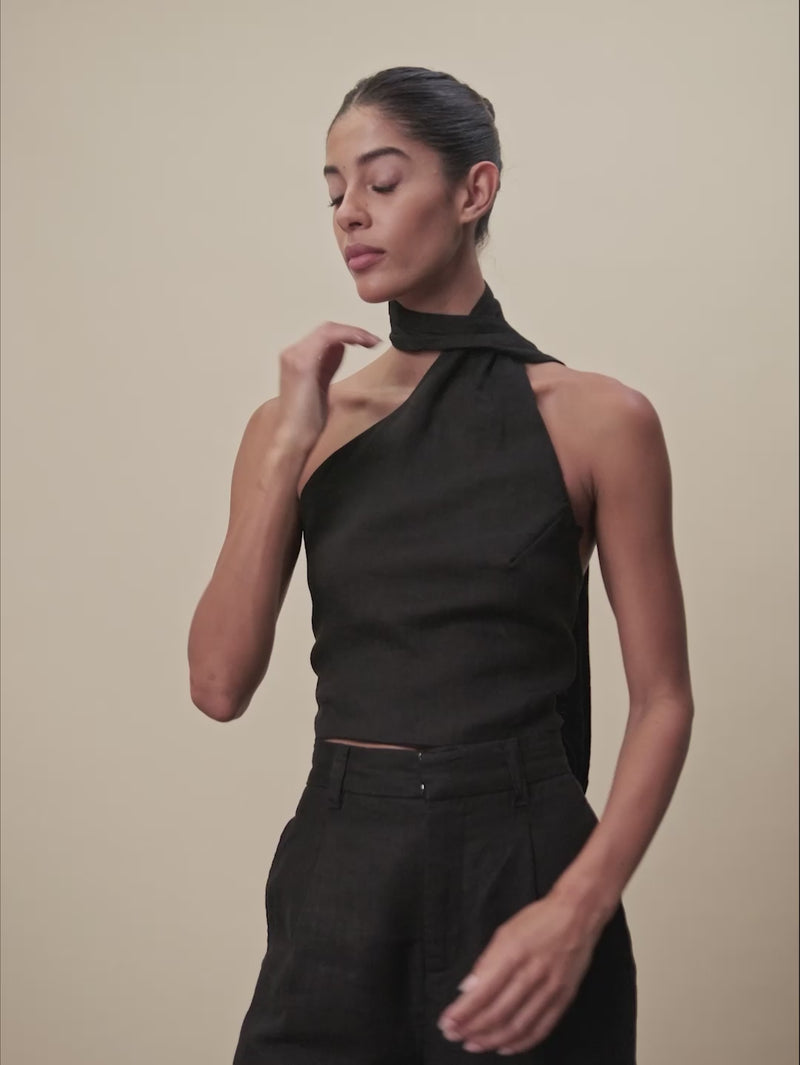 Black linen is a true black linen. It features tonal stitching and a clean hem.