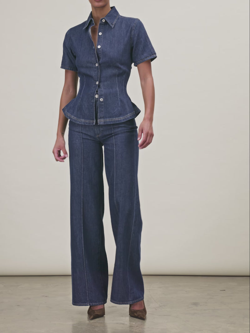 Joice Shirt is a cropped and fitted button down shirt with wider short sleeves.