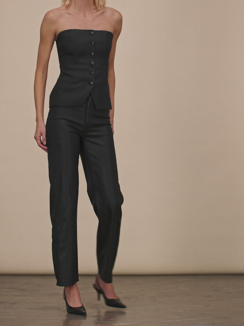 Black Coated is a wax coated, true black denim with a leather-like look. It features black oxide hardware, tonal stitching, a clean hem and a black back patch.