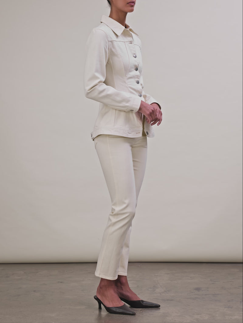 Ecru is a natural colored denim. It features a silver shank, copper rivets, tonal stitching, a clean hem and an ecru back patch.